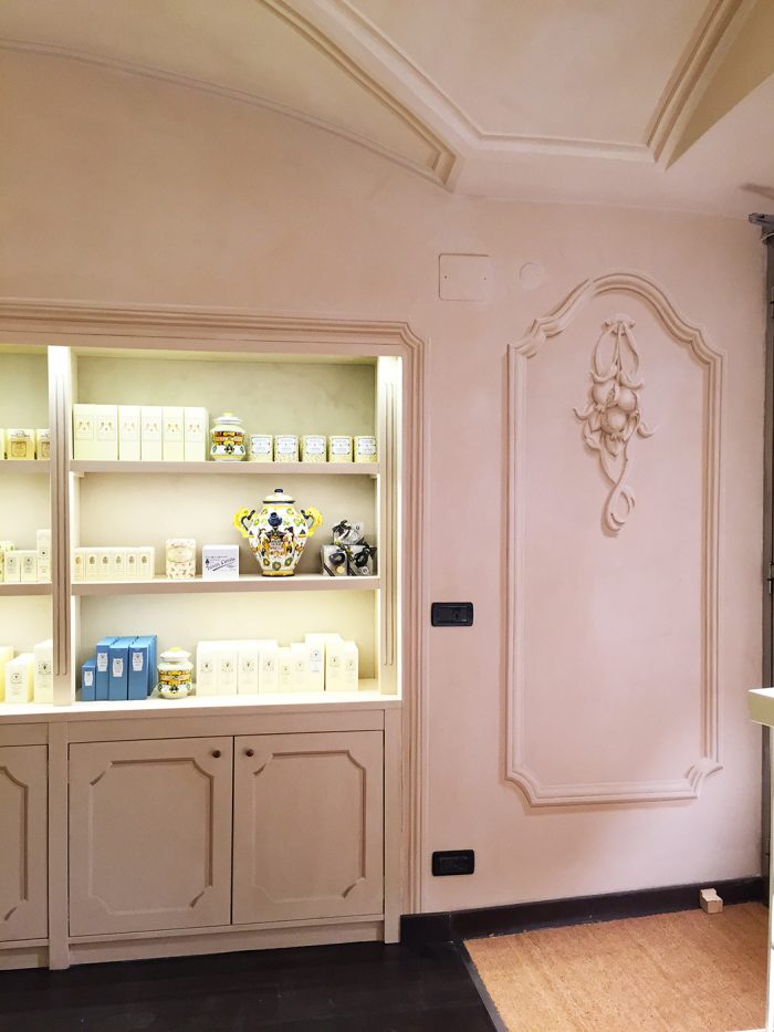 L’Officina di Santa Maria Novella è ritenuta una delle farmacie più antiche d’Europa e per il suo store in Genova abbiamo progettato e realizzato decorazioni classiche eseguite a calce che hanno donato al locale un’atmosfera calda, elegante dal sapore antico. Le decorazioni monocromatiche nei toni del beige hanno interessato anche il bancone e gli arredi lignei. Nella parete principale è stato ingrandito e dipinto a mano il logo antico. Per il mobile Barberia è stata riprodotto un fondale in finte piastrelle bianche le tipiche diamantine dipinte ad effetto trompe l’oeil e cornici con motivi liberty geometrici.